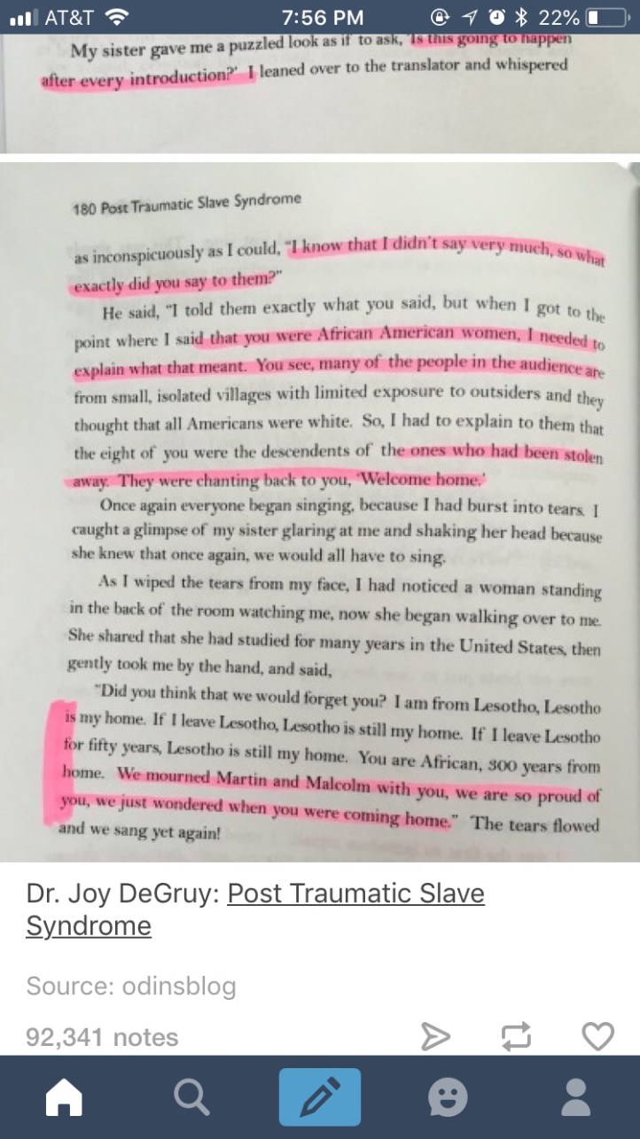 May 28, 2018 Jessie_Salsbury Post traumatic slave syndrome – Joy DeGruy http://reverseracism.tumblr.com/post/174320000723/odinsblog-dr-joy-degruy-post-traumatic-slave Share this: Click to share on X (Opens in new window) X Click to share on Facebook (Opens in new window) Facebook Like Loading...