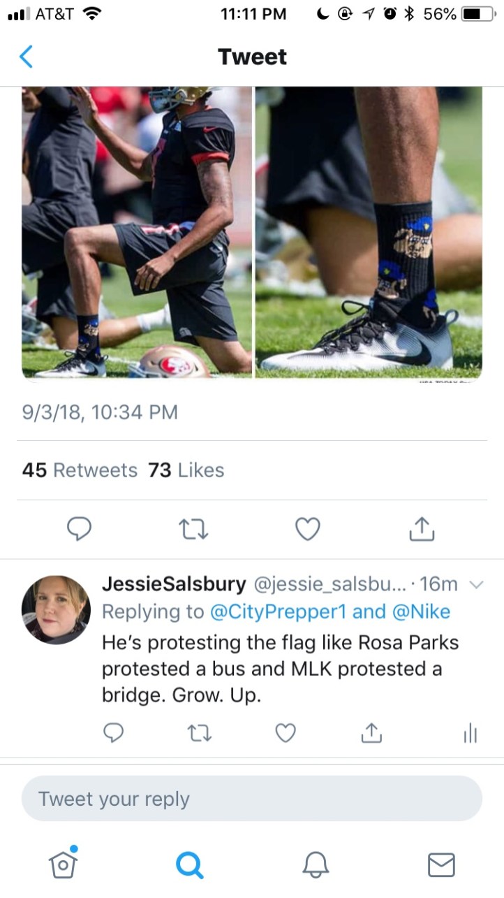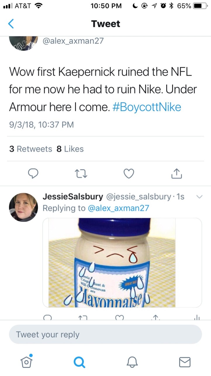 September 4, 2018 Jessie_Salsbury Kaepernick and the stupidity of the whites ™️©️®️ I’ve been responding to the whites with a crying jar of mayo on Twitter. It’s cathartic. Share this: Share on X (Opens in new window) X Share on Facebook (Opens in new window) Facebook Like Loading...