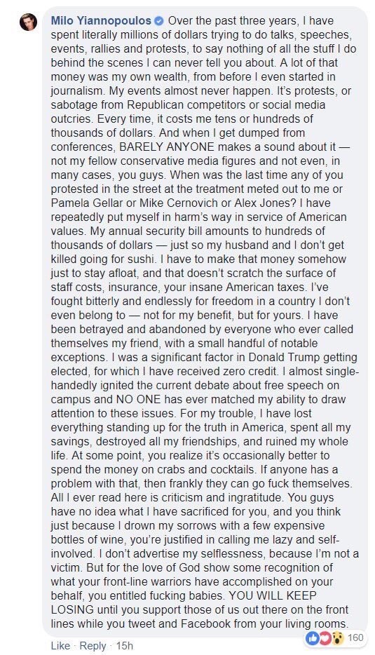 September 13, 2018 Jessie_Salsbury Boo hoo you’re racist and lost everything Crybaby attacks his fans Milo Yiannopoulos Share this: Click to share on X (Opens in new window) X Click to share on Facebook (Opens in new window) Facebook Like Loading...