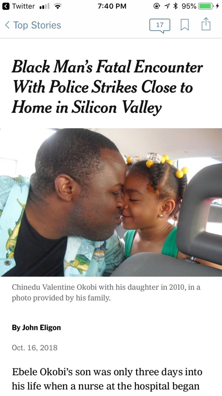 October 27, 2018 Jessie_Salsbury Fatal enounter Black Man’s Fatal Encounter With Police Strikes Close toHome in Silicon Valley Chinedu Valentine okobi Share this: Click to share on X (Opens in new window) X Click to share on Facebook (Opens in new window) Facebook Like Loading...