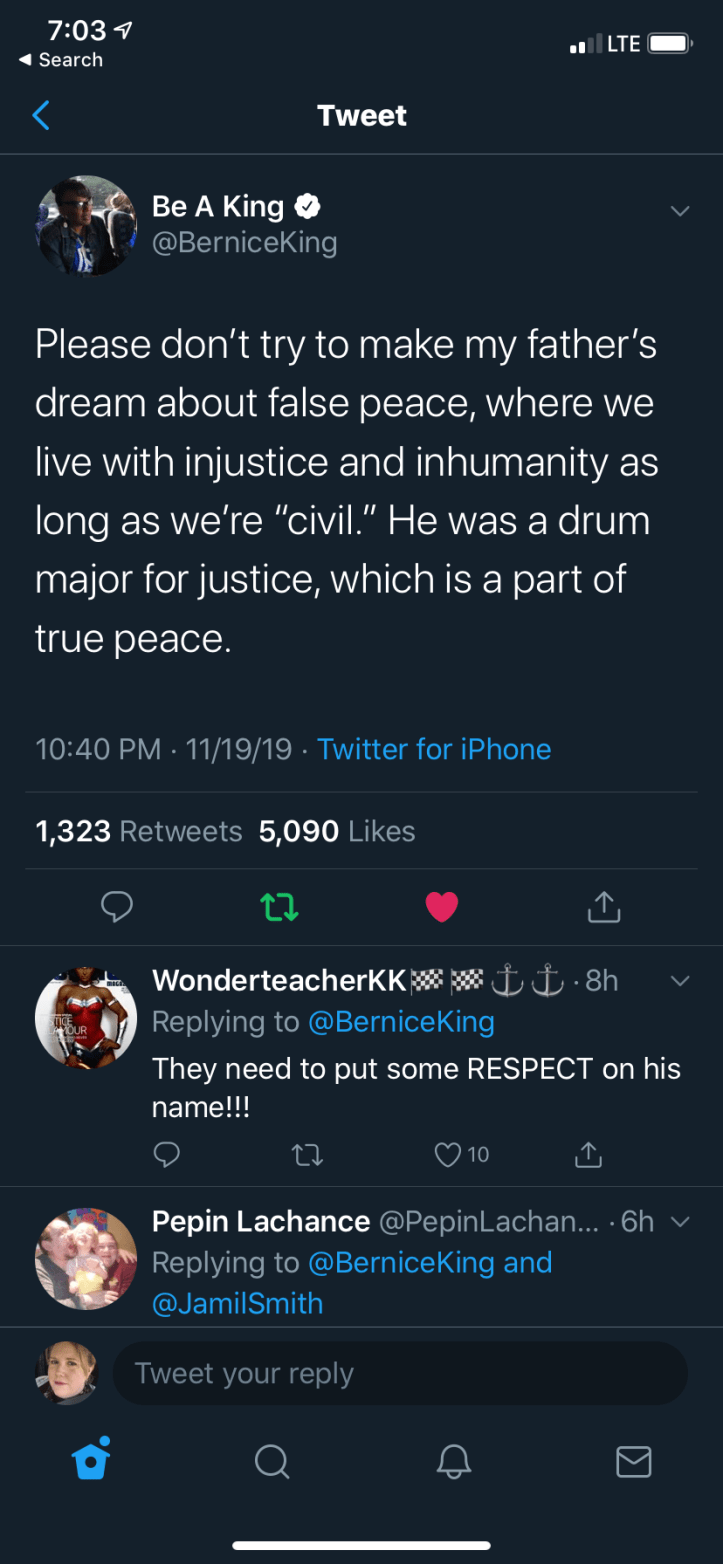 November 24, 2019 Jessie_Salsbury Bernice King – Quote on False Peace https://twitter.com/berniceking/status/1197011735716204544?s=21 Share this: Click to share on X (Opens in new window) X Click to share on Facebook (Opens in new window) Facebook Like Loading...