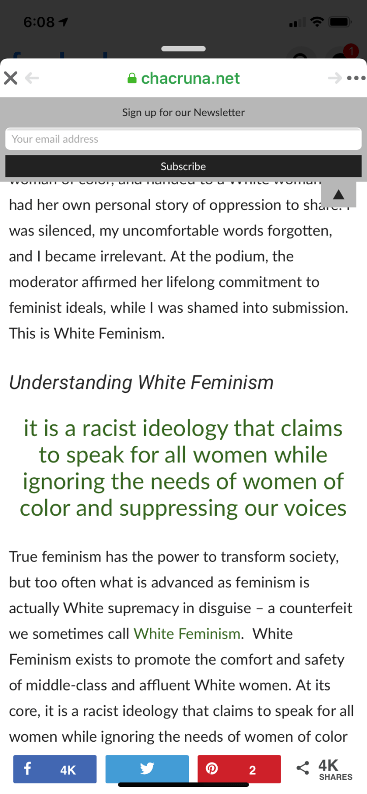 January 5, 2020 Jessie_Salsbury White supremacy in white feminism https://chacruna.net/how-white-feminists-oppress-black-women-when-feminism-functions-as-white-supremacy/ Share this: Click to share on X (Opens in new window) X Click to share on Facebook (Opens in new window) Facebook Like Loading...