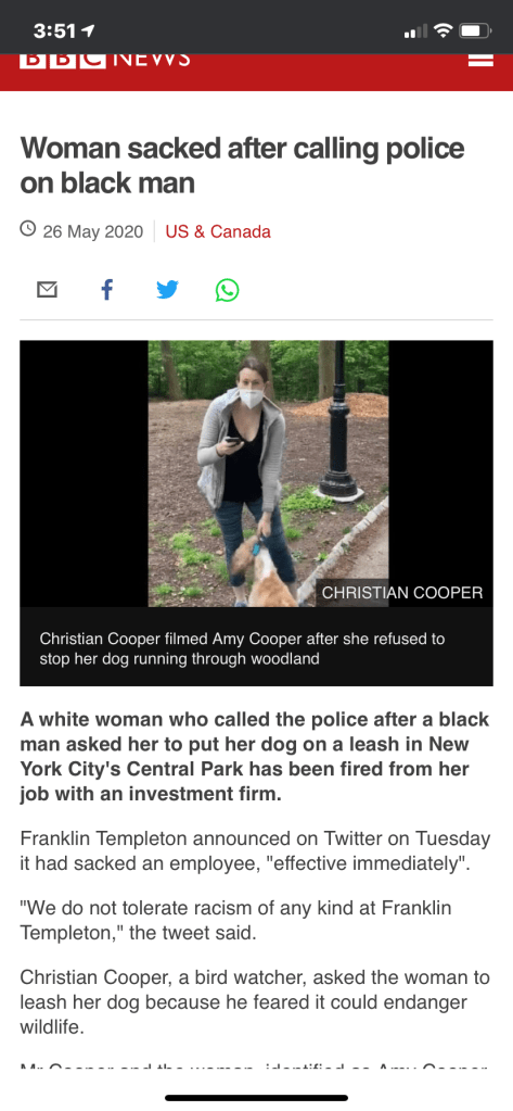 May 27, 2020 Jessie_Salsbury The Karen of all Karens and the Karen of all apologies https://www.bbc.com/news/amp/world-us-canada-52759502 Share this: Click to share on X (Opens in new window) X Click to share on Facebook (Opens in new window) Facebook Like Loading...