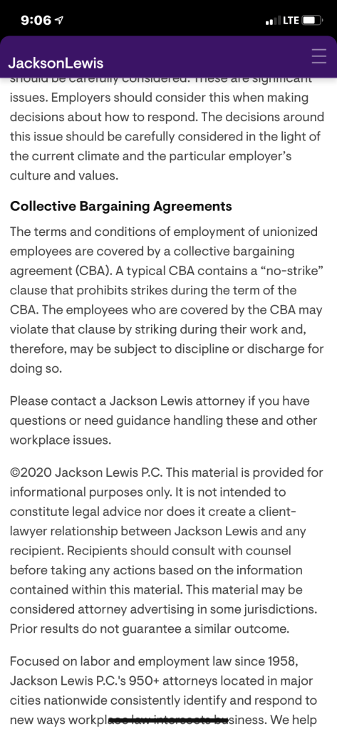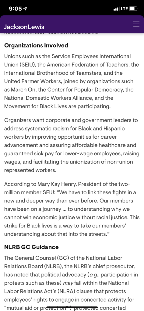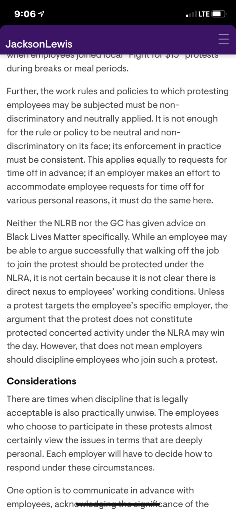 “Strike for Black Lives” May fall within NLRA 2006 demonstrations directly correlated with work. However, the employer had no control over the reform bill. Discipline for a strike or walk out might be legally acceptable but practically unwise. Watch for your employer communication on the topic if any is presented and give your reasons in return for your participation. Keep all documents not only at work but at home. Review if you are under a CBA and no strike clause. Check with union reps on any group action.